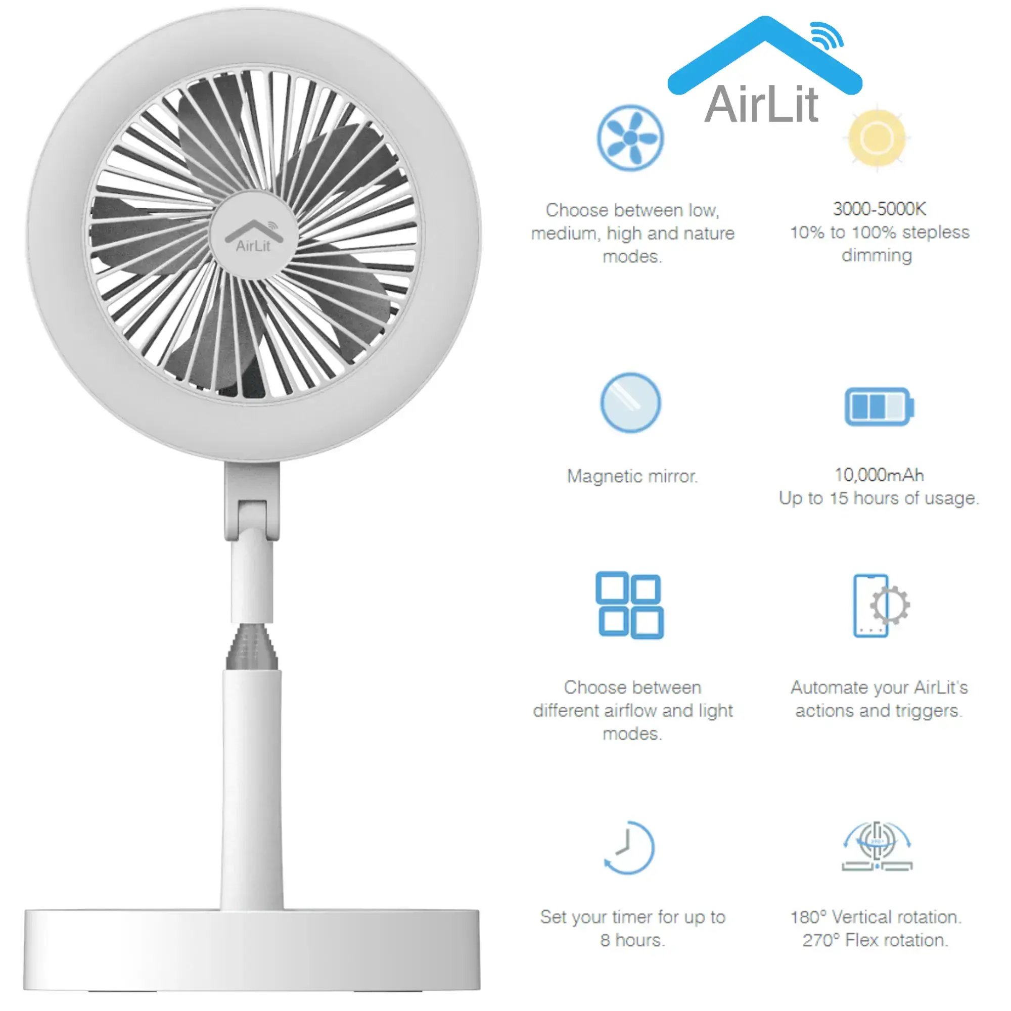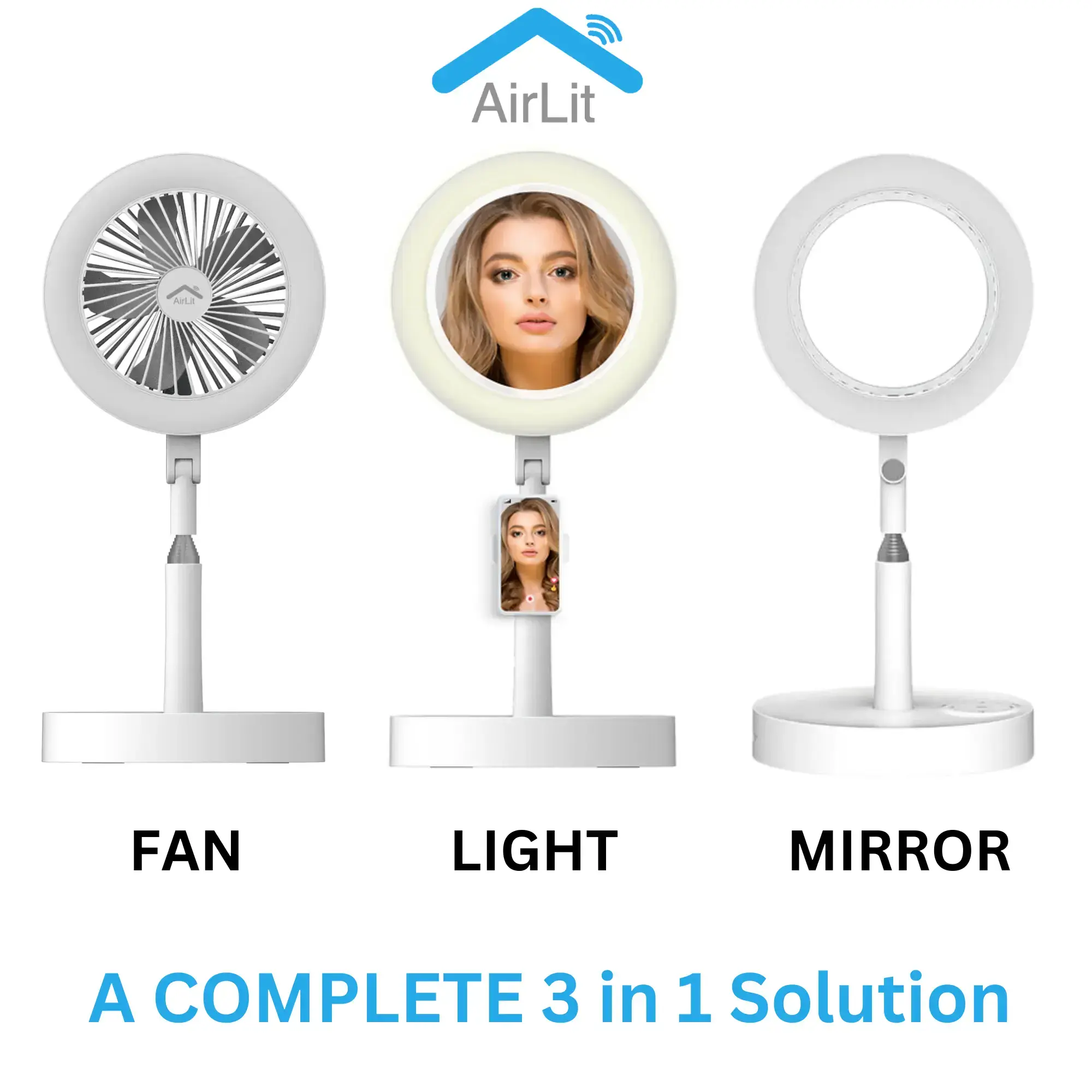 AirLit is a multipurpose device that adapts to your lifestyle, from cooling you down to getting ready for streaming and vlogging with the perfect light adjustable to your environment. It's your smart companion for your makeup, live streaming or even working from home.