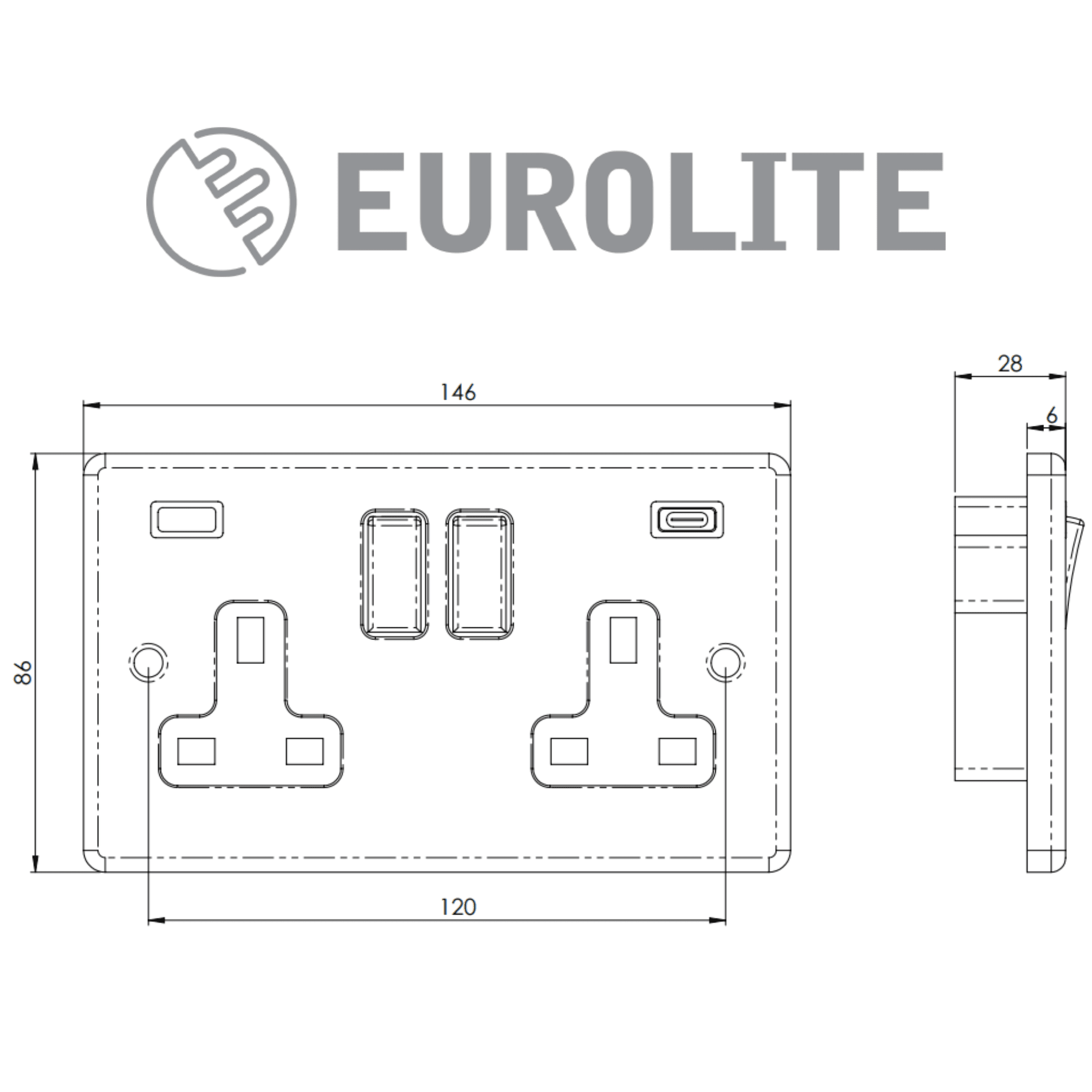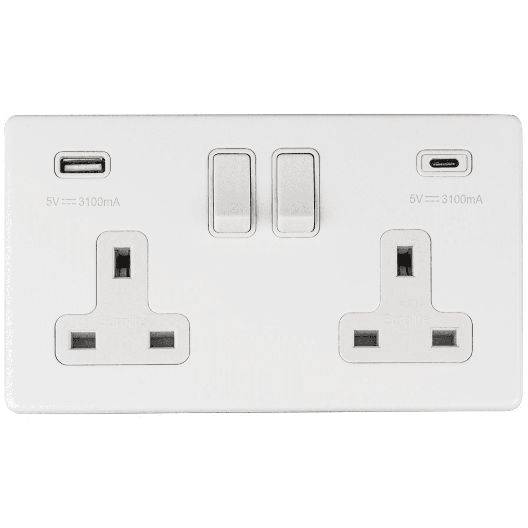 Eurolite, 2 Gang 13A Double Switched Sockets with 2x Fast Charging Ports 3.1A USB Outlets: 1x Type A & 1x Type C